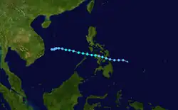 Utor spawned from an area of convection that developed off 907 km (565 mi) south-southeast of Guam on June 26, that remained quasi-stationary for 2 days before upgrading to a tropical depression on July 1 due to favorable conditions such as low vertical shear.[27] The depression strengthen into a tropical storm at 00:00 UTC on July 2.[13][27] Utor tracked west-northwest from a peripheral ridge and developed further, after entering the Philippine Area of Responsibility, and attained severe tropical storm status the following day. Utor was a large cyclone, with gale-force wind of 250 nmi (465 km; 290 mi).[11] Utor reached its peak strength on June 4, with 10-minute winds of 110 km/h (70 mph) and 1-minute winds of 150 km/h (95 mph), with the barometric pressure of 960 hPa (28 inHg).[13][11] Utor was centered 56 km (35 mi) near northern Luzon and tracked northwesterly as it began to weaken.[27] The storm made landfall near the east of Hong Kong on July 5 and quickly weakened before being last noted on July 7 by the JMA.[13]