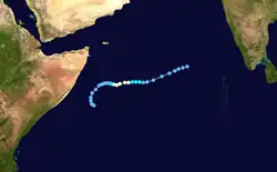 The lone system in the Arabian Sea in the season originated from a trough.[1] On November 10, an area of convection formed off the western coast of India. With little wind shear, the system organized further as it moved west-southwestward due to a ridge to the north.[21] On November 12, the system developed into a depression and quickly intensified into a deep depression.[1] That day, the JTWC classified the system as Tropical Cyclone 02A,[21] and it intensified into a cyclonic storm on November 13.[1] The storm was located at an unusually low latitude of 6° N.[2] After an eye developed in the center of the convection, the JTWC upgraded the storm to the equivalent of a minimal hurricane,[21] estimating peak winds of 150 km/h (95 mph) on November 14. By contrast, the IMD estimated peak winds of 100 km/h (60 mph),[22] making the system a severe cyclonic storm.[1] Subsequently, drier air weakened the storm, causing the convection to decrease.[21] By November 15, the storm had weakened to depression status while approaching Somalia.[1] That day, the JTWC discontinued advisories while the storm was about 520 km (320 mi) east of the Somalia coastline.[21] On November 16, the depression degenerated into a remnant low, and subsequently dissipated.[1]