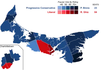 Binns' Progressive Conservatives were elected to a third consecutive majority government, the first time this had happened in Island history (for the PC party). The Premier, who ran in Murray River-Gaspereaux, was re-elected, along with his entire existing cabinet.