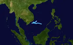 A small tropical disturbance rapidly formed, moving southwest on May 12. The small system rapidly built up on May 13. The next day, the JTWC classified it as Tropical Depression 05W. 05W moved west, affecting Vietnam and reached peak intensity as a tropical storm on May 15 and 16. With two other systems in the Western Pacific, Typhoon Nida and Tropical Storm Omais, 05W turned eastwards, weakening on May 17. Dissipating on May 18, and due to the strong pull of the outflow of Typhoon Nida at peak intensity, the remnants of 05W rapidly moved and was located about east of Philippines and was absorbed by a trough on May 20. The circulation fully dissipated on May 25 as it was absorbed by a monsoonal trough.