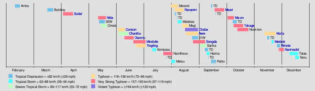 The 2004 Pacific typhoon season was an extremely active season that featured the second-highest ACE ever recorded in a single season, second only to 1997, which featured 29 named storms, nineteen typhoons, and six super typhoons. It was an event in the annual cycle of tropical cyclone formation, in which tropical cyclones form in the western Pacific Ocean. The season ran throughout 2004,[1] though most tropical cyclones typically develop between May and December. The season's first named storm and also the first typhoon, Sudal, developed on April 4, later was reached typhoon status two days later, and became the first super typhoon of the year three days later.[nb 1] The season's last named storm, Noru, dissipated on December 22.