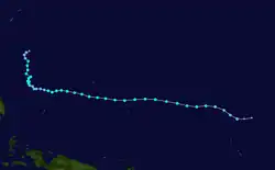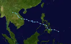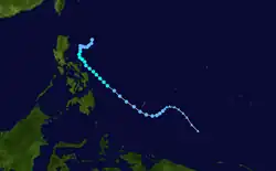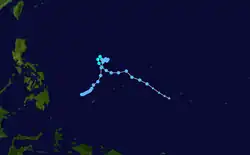 The near-equatorial trough spawned a tropical disturbance east of the Philippines late on March 13. It rapidly moved northwest as it became a tropical depression in the afternoon hours of the next day. Due to warm waters and moderate convection, it rapidly intensified, with a brief turn to the southwest. On March 17, it reached peak intensity as a tropical storm, with the PAGASA naming it as Butchoy. The system rapidly weakened on March 19, just before the storm was about to hit the Philippines. A weak trough brought it northward, where dry air and vertical shear caused it to dissipate on March 23.[7]