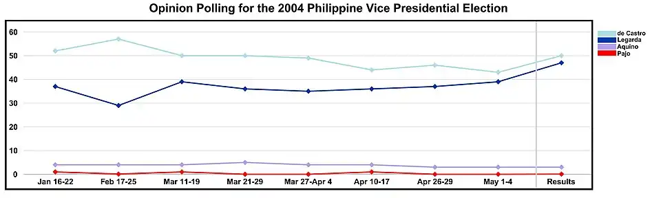 25. ^ a b Tabunda, Ana Maria (February 24, 2004). "Filipinos' Presidential Preferences: Still a Tight Race for the Presidency". Pulseasia.ph. Retrieved January 11, 2014.