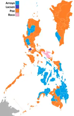 Arroyo won in Western and Central Visayas, western parts of northern Luzon, northern Mindanao and in the Autonomous Region in Muslim Mindanao. Poe, on the other hand, won in Eastern Visayas, Metro Manila, southern Luzon, eastern parts of Northern Luzon and southern Mindanao. Arroyo is the first candidate to win the presidency despite losing the Lingayen-Lucena corridor.