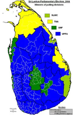 ![]() Winners of polling divisions. UPFA in blue and UNF in green. | |||||||||||||||||||||||||||||||||||||