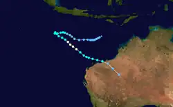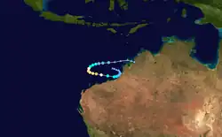 At this point, the Bureau of Meteorology had high uncertainty regarding the cyclone's future track, which generally pointed Kara to move southwards towards the Western Australian coast. Therefore, cyclone watches and warnings were issued for the entire Pilbara coast, extending as far east as Broome. The cyclone reached peak intensity late on 26 March, and began to rapidly weaken the next day due to increasing wind shear.[7] The JTWC issued its last advisory on the evening of 27 March, and TCWC Perth followed suit early on 28 March as Kara dissipated near Eighty Mile Beach in Australia.