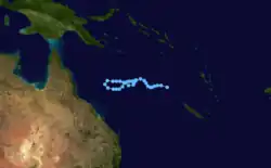 During 25 March, TCWC Brisbane started monitoring a tropical low that was located about 390 km (240 mi) to the south-west of Honiara in the Solomon Islands.[11] Over the next day the system moved south-eastwards in an area of low vertical wind shear and moved into the South Pacific basin where the Fiji Meteorological Service started monitoring it as Tropical Depression 13F.[11]