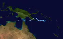 Early on 16 May, slightly more than two weeks after the official end to the Australian cyclone season, the Tropical Cyclone Warning Centre in Brisbane identified a tropical low east-southeast of Papua New Guinea. The low organised quickly in the Soloman Sea, and the Joint Typhoon Warning Center issued a Tropical Cyclone Formation Alert on it several hours later. TCWC Brisbane named the system Tropical Cyclone Pierre early the next day. The JTWC issued its first advisory on Tropical Cyclone 24P several hours later, as the cyclone moved westward. Later that day, Pierre encountered increased wind shear and dry air, disrupting the system and inhibiting its development.[8] These unfavourable conditions eventually caused the system to lose its convection and degenerate into a tropical low shortly before making landfall in Papua New Guinea.[9] After that, Ex-Tropical Cyclone Pierre entered the northern part of the Coral Sea and threatened to produce heavy rainfall and thunderstorms with damaging wind gusts across Cape York Peninsula.[10]