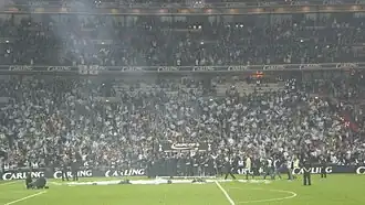 ![]() Tottenham Hotspur players and fans celebrating their win the 2008 Football League Cup Final | ||||