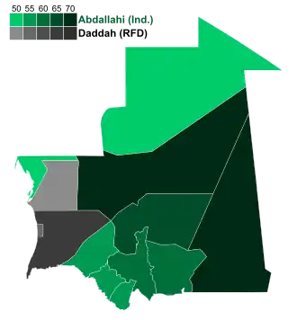 Following the election, on March 26, Interior Minister Mohamed Ahmed Ould Mohamed Lemine declared Abdallahi the winner, saying that he won 52.85% of the vote.[45] Abdallahi won 10 out of the country's 13 regions; Daddah won in Nouakchott, Inchiri Region, and Trarza Region.[46] Turnout was about 67.5%.[45] Daddah accepted the results and congratulated Abdallahi on his victory.[3] The results were confirmed on 29 March 2007.[47]