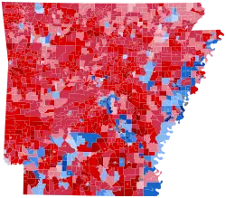Although former President Bill Clinton, a Democrat, easily carried his home state of Arkansas in 1992 and 1996, the state was largely considered a safe state for McCain. Early polls gave McCain a 9-point lead among possible voters on Election Day.[26] Although the state was still strongly Democratic at the non-presidential levels, on Election Day, Arkansas voted for McCain by a margin of approximately 20% — ten points better than Bush's showing four years earlier. In this election, Arkansas voted 27.12% to the right of the nation at-large.[27]