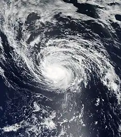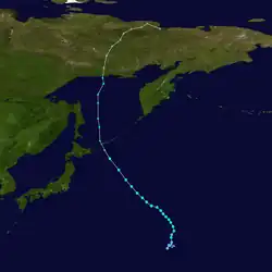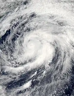With warm sea surface temperatures and decreasing wind shear, Mawar developed a central dense overcast.[73] This led to the JMA upgrading Mawar to a severe tropical storm on June 2.[74] The JTWC subsequently upgraded it to a Category 1 typhoon as a developing eye feature was seen on microwave imagery.[75] Turning northeastward as a mid-latitude trough weakened the subtropical ridge to the northeast, Mawar further intensified into a Category 2 typhoon early on the next day, as a ragged eye became visible on satellite imagery.[76] The JMA followed suit and upgraded Mawar to a typhoon later that same day.[77] By June 4, Mawar reached its peak intensity,[78][79] before it started to weaken due to the mid-latitudes impacting the system's overall structure, with its eye breaking down into tight spiral banding, prompting the JTWC to downgrade the system to a category 2 typhoon.[80] On the next day, the PAGASA issued their final advisory on Mawar, as it was exiting the Philippine Area of Responsibility.[81] Mawar further weakened into a category 1 typhoon as its low-level circulation center widened, and was entering a hostile environment due to its interaction with the jet stream.[82] The JMA subsequently downgraded Mawar to a severe tropical storm,[83] as it commenced its extratropical transition.[84] Late on the same day, the JTWC issued their final advisory on Mawar, as it was deeply embedded in the baroclinic zone and its low-level circulation center had decoupled behind its convection.[85] On June 6, Mawar fully became an extratropical cyclone, and the JMA issued their final advisory on the system.[86] The system was last noted east of the Kamchatka Peninsula on June 13.[87]