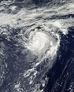 Late on the next day, the JTWC upgraded Sanvu to a category 1 typhoon, as an eye was seen on microwave imagery.[50] Late on May 24, the JMA upgraded Sanvu to a severe tropical storm.[51] Accelerating northeastward along the northwestern periphery of a subtropical ridge, the system reached its peak intensity by the next day, as its eye emerged on satellite imagery.[52][53][54] As its western quadrant got affected by a dry air entrainment on May 26, Sanvu started to weaken as it directly passed over Iwo Jima.[55] With strong vertical wind shear associated with a subtropical jet stream, along with rapidly cooling sea surface temperatures, the system continued to weaken.[56] The JTWC downgraded Sanvu to a tropical storm late on the same day, as the system's low level circulation center started to become exposed.[57] The JMA followed suit by the next day.[58] The JTWC subsequently issued their final advisory on Sanvu, as it commenced extratropical transition.[59] However, the JMA continued issuing advisories on Sanvu, until by the next day, when it fully transitioned into an extratropical cyclone.[60][61] The remnants of the system was last noted during May 30.[62]