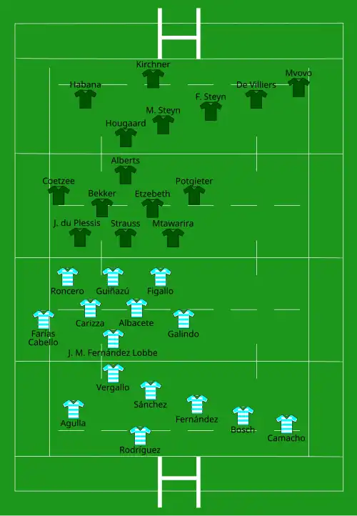 | Try: Fernández 16' c Con: Rodríguez (1/1) 17' Pen: Rodríguez (3/5) 11', 35', 50' | Report[12] | Try: F. Steyn 64' c Con: M. Steyn (1/1) 65' Pen: M. Steyn (3/7) 32', 48', 53' |