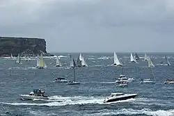 Competing sailors leaving Sydney Harbour, North Head visible in the background