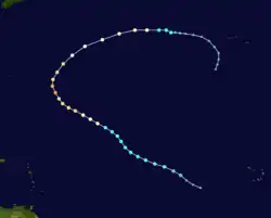 A tropical wave accompanied by a broad area of low pressure exited the western coast of Africa on September 6, acquiring sufficient organization to be declared a tropical depression by 12:00 UTC on September 11. Twelve hours later, the depression intensified into Tropical Storm Edouard. The newly formed cyclone moved northwest, steered around a subtropical ridge to its northeast. The storm intensified in a generally favorable environment and became a hurricane by 12:00 UTC on September 14. With a well-defined eye surrounded by intense eyewall convection, Edouard further strengthened into a major hurricane early on September 16, attaining peak winds of 120 mph (195 km/h) at 12:00 UTC, the first major hurricane in the Atlantic since Hurricane Sandy in 2012. The cyclone abruptly weakened thereafter as it curved northeastward in advance of an upper-level trough, falling below hurricane intensity by 00:00 UTC on September 19 and degenerating into a remnant low eighteen hours later. The remnant low moved generally southward, merging with a frontal boundary well south-southwest of the Azores on September 21.[64]