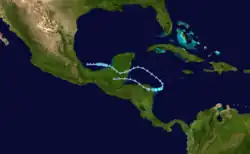 An area of low pressure interacted with an atmospheric Kelvin wave, leading to the formation of a tropical depression in the Bay of Campeche at 18:00 UTC on August 31. Six hours later, the depression was upgraded to Tropical Storm Dolly. Steered generally westward by a mid-level ridge to its north, the cyclone struggled with strong wind shear and reached peak winds of 50 mph (80 km/h) at 12:00 UTC on September 2. At 04:00 UTC the next day, Dolly moved ashore just south of Tampico, Mexico, with winds of 45 mph (70 km/h). Following landfall, the mountainous terrain of eastern Mexico quickly caused the cyclone to degenerate into a remnant low at 12:00 UTC on September 3. The post-tropical low continued westward prior to dissipating the next day.[58]