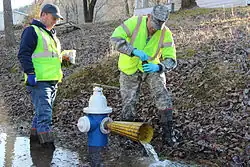 The Environmental Protection Agency had found no violations and had not taken enforcement actions against the Freedom Industries Charleston facility within the last five years.[4][17] DEP did reveal that the facility had been the subject of a previous "odor complaint" "several years ago," although the complaint was determined by DEP to be unfounded.[20] Following the spill, the DEP issued a violation notice on January 10 to Freedom Industries for releasing MCHM into the air and violating West Virginia's Air Pollution Control Act and the Water Pollution Control Act, and it subsequently ordered that its Charleston facility's 11 other tanks be emptied and the chemicals moved off site.[4][14][17][21] By the night of January 9, the West Virginia National Guard began testing the contaminated water in the Elk River.[29] The National Guard utilized its own lab, in addition to labs from DuPont and the West Virginia Department of Health and Human Resources.[29] The National Guard requested two additional labs to expedite the water testing process.[29] West Virginia American Water coordinated with DuPont and the United States Army Corps of Engineers to determine the contamination level within its system.[17] A total of four labs were set up to continue testing the amount of the chemical remaining in the water.[23]