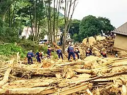 Japanese Prime Minister Shinzo Abe directed the military to deploy hundreds of personnel to assist the local rescue teams.[4] Japanese Red Cross[23] and the NPO Peace Winds Japan[24] also sent staff, and an estimated 1,300 people have volunteered. Disaster Volunteer of Hiroshima City decided to discontinue activities on 24 August.[25] Volunteers continued later, but stopped temporarily on 4 September because of bad weather.[26]