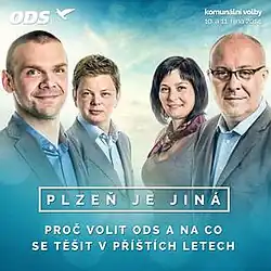 Civic Democratic Party led campaign with slogan "Plzeň is different" with subtitle "We didn't play a theatre, we build it." Party's billboards used blue colour which contrasted with campaign of other parties that used white colour. ODS presented itself by successes of its rule over the city in previous term.[9][10] Campaign of Civic Democrats was awarded by 8 Golden Ballot Awards.[11] Campaign of ODS was manufactured by Adam Hejl, Michal Kupilík and Petr Sokol.[12]