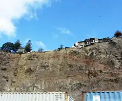A number of cliffs collapsed at Scarborough (Godley Head and Whitewash Head), Richmond Hill, and Sumner (Peacock's Gallop). The shipping containers that were still placed along Peacock's Gallop on Main Road stopped falling rocks from hitting passing cyclists.[7] Two surfers were below Whitewash Head and had car-size rocks crash into the sea around them.[8]
