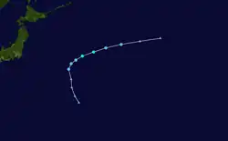 During July 21, a subtropical disturbance developed at the tailend of a mid-latitude trough of low pressure, about 775 km (480 mi) to the east of Iwo-To.[53] Over the next day, deep atmospheric convection developed over the system's elongated low level circulation center, before it was classified as a tropical depression by the JMA during July 22.[53][54] Over the next day, as the storm moved north-northeastwards around a subtropical ridge of high pressure, its structure improved as it developed a warm core and consolidated.[55] The hybrid system was subsequently classified as Tropical Storm 04W by the JTWC during July 23, before the JMA named it Lupit later that day.[54][55] Over the next day, Lupit peaked with sustained winds of 75 km/h (47 mph), as it went through an extratropical transition and took on frontal characteristics.[54][56] Lupit subsequently became extratropical during July 24, before it dissipated during July 26, as it moved into the Sea of Okhotsk.[54]