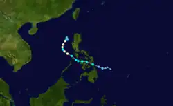 On July 2, a tropical depression formed 780 km (480 mi) to the southeast of Yap State.[31][32] The following day, the depression became a tropical storm, receiving the name Nepartak.[31] By July 4, organization increased and Nepartak intensified into a severe tropical storm.[31] At that time, PAGASA assigned the local name Butchoy as it entered their area of responsibility.[33] Early on July 5, Nepartak started to undergo rapid intensification, reaching typhoon strength.[31] Nepartak soon reached Category 5 super typhoon intensity.[nb 5][34] During the course of July 6, Nepartak reached its peak intensity with 10-minute sustained winds of 205 km/h (125 mph) and a minimum barometric pressure of 900 mbar.[31][35] Nepartak started weakening during the next day, before making landfall in Taitung City on July 8. Nepartak weakened to a tropical storm[31][36] as it made its second landfall in Shishi, Fujian.[37] Nepartak rapidly deteriorated over land and fully dissipated on July 10.[31][38]