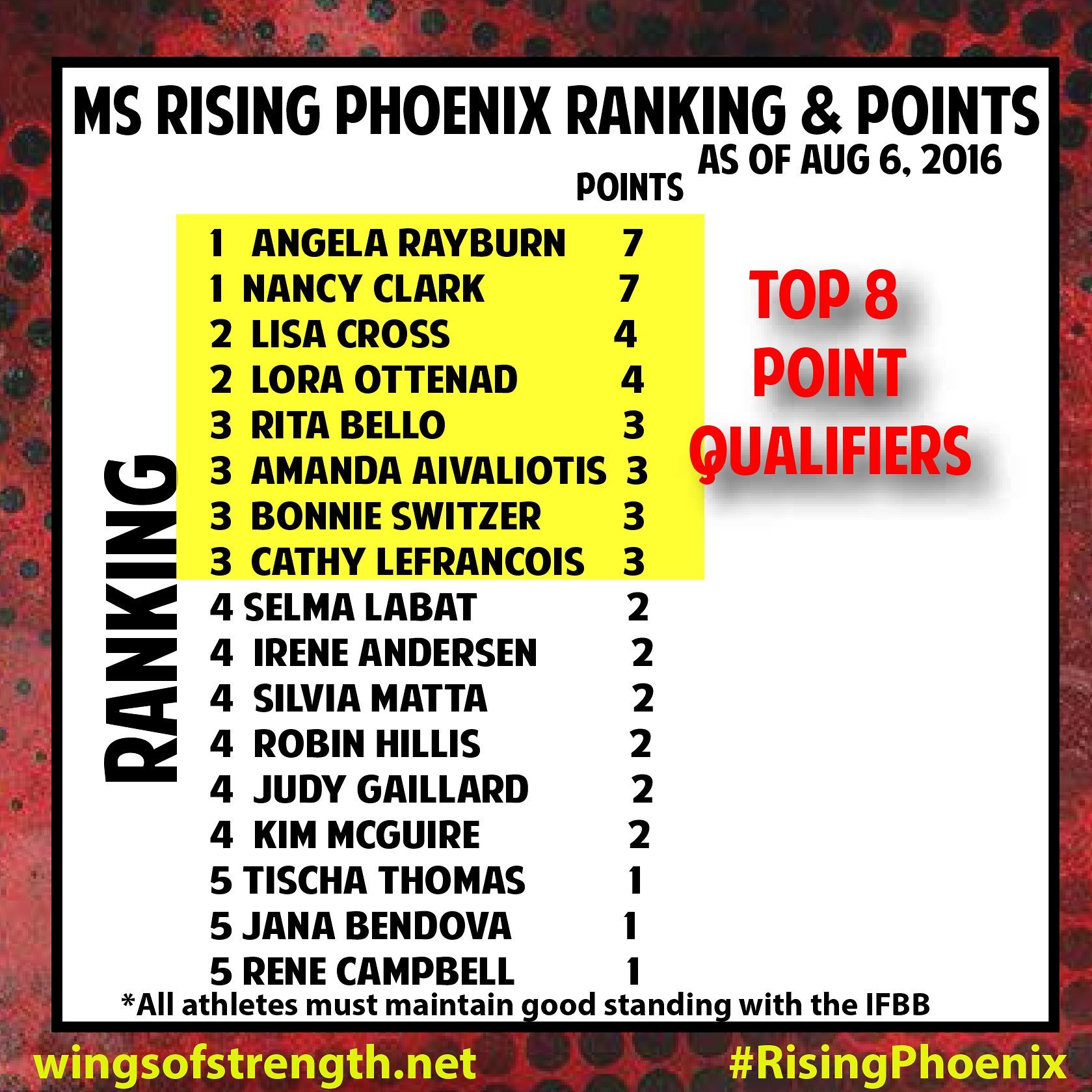 1 In the event of a tie, the competitor with the best top five contest placings will be awarded the qualification. If both competitors have the same contest placings, than both will qualify for the Rising Phoenix World Championships.