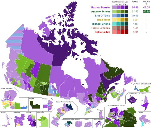 Andrew Scheer was elected leader on the thirteen ballot, narrowly defeating second-place finisher Maxime Bernier. Many considered Scheer's victory as an upset, given Bernier's consistent frontrunner status in the polls.[5]