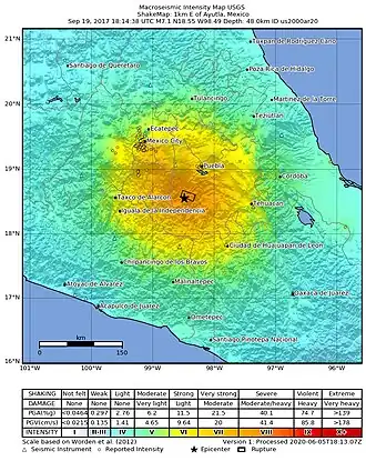 - ^ a b Montalvo-Arrieta, Juan C.; Pérez-Campos, Xyoli; Ramirez-Guzman, Leonardo; Sosa-Ramírez, Rocío L.; Ruiz-Esparza, Moisés Contreras; Leonardo-Suárez, Miguel (2019). "Macroseismic Intensities from the 19 September 2017 Mw 7.1 Puebla–Morelos Earthquake". Seismological Research Letters. 90 (6): 2142–2153. Bibcode:2019SeiRL..90.2142M. doi:10.1785/0220190145. S2CID 210730927.