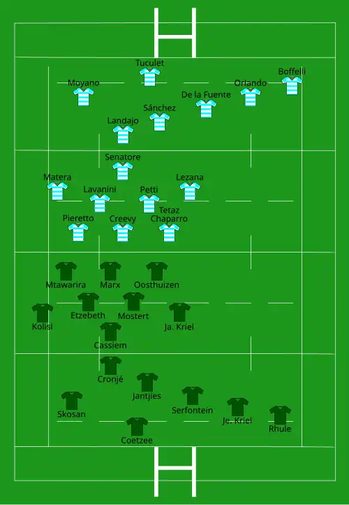 | Try: Moyano 27' c Moroni 58' c Con: Hernández (1/1) 28' Sánchez (1/1) 59' Pen: Boffelli (2/2) 3', 60' Hernández (1/1) 43' | Report[11] | Try: Kolisi (2) 19' c, 48' c Jantjies 38' c Penalty try 56' du Preez 77' c Con: Jantjies (4/4) 20', 38', 48', 79' Pen: Jantjies (2/4) 27', 71' |