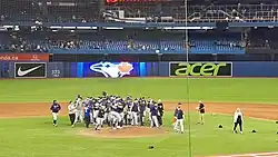 Rays celebrate on the field in Toronto after winning a wild card spot, September 27th.