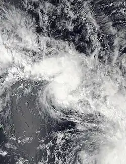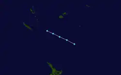 During December 8, the FMS reported that Tropical Disturbance 01F had developed about 145 km (90 mi) to the northeast of Apia in Samoa.[4] At this stage, the system had a broad low level circulation and was located within a marginal environment for further development, with warm sea surface temperatures as well as moderate levels of vertical wind shear.[5] Over the next couple of days, the system gradually moved westwards before the FMS classified it as a tropical depression during December 11, while it was located about 280 km (175 mi) to the west of the Fijian Dependency of Rotuma.[6] At 00:00 UTC on December 11, the JTWC upgraded the system to a tropical storm on the Saffir–Simpson hurricane wind scale.[7] The depression continued to consolidate, with deep convection wrapping into the centre of the system from the northern semicircle, and by 12:00 UTC, one-minute sustained winds had increased to 75 km/h (45 mph).[8] A few hours later, the FMS estimated maximum 10-minute sustained winds to be at 55 km/h (34 mph), with a minimum central atmospheric pressure of 998 hPa (29.47 inHg).[9] However, environmental conditions were only marginally conducive for intensification, with strong vertical wind shear inhibiting further development.[8] By 00:00 UTC on December 12, both the JTWC and the FMS reported that the shear had displaced the system's deep convection to the northeast, leaving the center of circulation fully exposed.[10][11] Due to the deteriorating structure of the system, the FMS ceased advisories on Tropical Depression 01F at this time.[11] The storm then weakened and degenerated into a low pressure system later on December 12. Because of the Fujiwhara effect, the remnant was absorbed by Tropical Depression 02F shortly afterward, which would later become Severe Tropical Cyclone Yasa.[12]