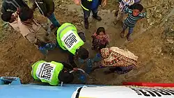 Local rescuers assisted by Baitulmaal (a Dallas-based international humanitarian organization) helped evacuate surviving residents of Karachi's Gulberg Town.[23] The team provided them with hot meals, water, hygiene supplies, and food parcels and provided drinking water to other flood-affected areas of Karachi, such as Yousuf Goth and Abdullah Town.[23] Employees of Baitulmaal delivered supplies via truck to individuals who were unable to escape in time.[23]