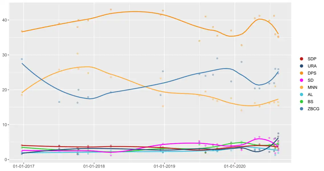 On 1 May 2019, the Socialist People's Party (SNP), United Montenegro (UCG), Workers' Party (RP) and Independent group in the parliament agreed to form a new catch-all political alliance under the name For the Benefit of All.[17][18] The alliance eventually dissolved prior the election. In August 2020, all three parties decided to join a pre-election coalition with right-wing Democratic Front (DF) alliance, under the name For the Future of Montenegro,[19] as did some minor political parties, such as the True Montenegro (PCG), Democratic Party of Unity (DSJ), Democratic Serb Party (DSS) and Yugoslav Communist Party (JKP).[20]