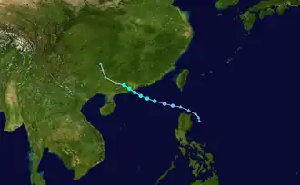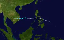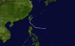 On July 29, a tropical disturbance formed and was situated a couple hundred miles east of Manila, Philippines. Struggling to consolidate, the disturbance crossed Luzon with little to no organization and began organizing in the South China Sea. Environmental conditions became conducive for development, and the JMA declared that a tropical depression had formed in the early hours of July 31.[67] Then early on August 1, the depression intensified into Tropical Storm Sinlaku.[68] The storm failed to intensify much afterward, and during the following day, Sinlaku made landfall on northern Vietnam.[69] Shortly thereafter, both agencies issued final advisories on the storm.[70][71]