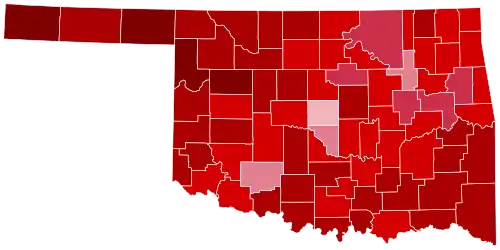 Trump easily carried Oklahoma on Election Day by a margin of 33.08%, down from 36.39 points in 2016. Oklahoma was one of two states where Trump won every county (though Oklahoma County was won by a plurality of votes, compared to the absolute majorities achieved across the state), the other being West Virginia. This also signaled the fifth consecutive election in which the Republican candidate carried every county in the state, including those counties encompassed by Native American reservations. In this election, Trump also became the first presidential candidate ever to win more than a million votes in Oklahoma.[4] Biden, however, came within 3,326 votes of winning Oklahoma's most populous county Oklahoma County, and won more than 40% of the vote in Oklahoma's second-most populous county Tulsa. No Democratic presidential candidate has won Oklahoma County since Lyndon B. Johnson in his 1964 landslide, or Tulsa County since Franklin D. Roosevelt in his 1936 landslide. This is the first election since 2000 in which not every county voted in the majority for the Republican, as Oklahoma County was won by Republicans with a 49.21% plurality. However, these gains in urban Oklahoma were partly offset by continued falloff in southeast Oklahoma, where Biden even underperformed Hillary Clinton's performance four years earlier in most counties.