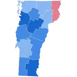 Biden easily emerged victorious in the Green Mountain State 66.09% to 30.67%, a margin of 35.4%. This is the first time Vermont was the strongest state for either party since 1956, when it was Republican Dwight D. Eisenhower's best state. Vermont also saw the largest increase in turnout from 2016, increasing 14.3%.[4] Biden greatly improved on Hillary Clinton's 55.7% vote share and 25.9% margin from 2016, when third-party candidates received over 14% of the vote; with an improvement of 9% in the margin of victory, this marked the strongest leftward shift any state experienced in 2020.[5] Biden's performance was also the fourth-strongest Democratic performance in state history, as well as the third-largest Democratic margin of victory. Trump carried only one county, sparsely populated Essex bordering New Hampshire, which had voted for the winner from 1980 to 2016. Consequently, Biden became the first president to win without the county since Jimmy Carter in 1976.