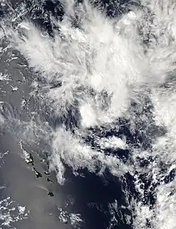 On February 4, the United States Joint Typhoon Warning Center reported that a tropical disturbance had developed within the Australian region about 1,285 km (800 mi) to the west of New Caledonia.[31] The disturbance was starting to develop a low-level circulation, which was accompanied by fragmented atmospheric convection, along a frontal boundary that extended across the Cape York Peninsula and the Coral Sea.[31] Over the next couple of days, the Australian Bureau of Meteorology (BoM) and the Fiji Meteorological Service (FMS) started to monitor the poorly organized system as Tropical Low 18U and Tropical Disturbance 08F, as it moved eastwards within the frontal boundary towards Vanuatu and the South Pacific basin.[32][33][34] During February 7, the system started to slowly consolidate, as it passed to the north of New Caledonia, before the FMS classified the system as a tropical depression.[35][36] At this stage, the depression was moving eastwards and was predicted to continue to move eastwards towards Fiji, however, the depression slowed down as it approached the islands of southern Vanuatu during February 8.