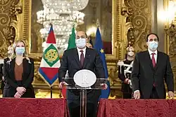 During a late-night Council of Ministers, Conte strongly criticised Renzi, stating that "Italia Viva has assumed the serious responsibility of opening a government crisis. I am sincerely sorry for the considerable damage that has been done to our country by a government crisis in the midst of a pandemic. [...] The gravity of this decision cannot be diminished."[19] The Prime Minister was soon backed by the secretary of the Democratic Party, Nicola Zingaretti, who labeled the crisis as a "very serious mistake against Italy" and "an act against our country",[20] while the Minister of Culture, Dario Franceschini, head of the Democratic delegation in the government, stated: "Whoever attacks the Prime Minister, attacks the entire government; Giuseppe Conte has been serving the country with passion and dedication against the most serious challenges we've ever faced in the history of our Republic".[21] The Minister of Foreign Affairs and former leader of the M5S, Luigi Di Maio, described Renzi's decision as a "reckless move", asserting that "Prime Minister Conte and President Sergio Mattarella are the only two pillars Italy has in this moment of uncertainty";[22] while Roberto Speranza, Minister of Health and de facto leader of Free and Equal (LeU), said that Conte "has served the country with discipline and honor", adding that LeU still supported him.[23] Moreover, many other prominent members of the cabinet like Stefano Patuanelli, Alfonso Bonafede, Vincenzo Spadafora and Riccardo Fraccaro expressed their support to Conte.[24] The opposition leaders, Matteo Salvini and Giorgia Meloni, immediately asked for snap elections.[25]