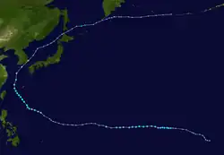 On May 27, the JMA and the JTWC noted the persistence of an area of atmospheric convection about 425 nautical miles (787 km; 489 mi) south-southeast of Guam.[57] The area's nearby environment exhibited low wind shear and warm sea surface temperatures, which were ideal conditions for tropical cyclogenesis.[58] The JMA assessed the area to have developed into a tropical depression on May 29 at 06:00 UTC.[59] The PAGASA made a similar assessment in a Tropical Cyclone Advisory issued at 15:00 UTC.[60] The JTWC later followed with their own assessment, identifying the center of the newly developed tropical depression and assigning the designation 04W.[61] As the system tracked westward, it entered the Philippine Area of Responsibility at 01:00 PHT (17:00 UTC).[62] The PAGASA then named the storm Dante in its first Tropical Cyclone Bulletin for the storm.[63] Dante further organized in the Philippine Sea,[64] and on May 30 at 15:00 UTC, the JTWC upgraded it to a tropical storm,[65] with the PAGASA doing the same at 21:00 UTC.[66] On the next day at 00:00 UTC, the JMA also upgraded Dante into a tropical storm, giving it the international name Choi-wan.[67] Choi-wan's center was exposed due to a tropical upper tropospheric trough from the northeast, inducing shear on the system.[68] On June 1 at 12:30 UTC, Choi-wan made landfall on Sulat, Eastern Samar as a minimal tropical storm,[69] with the JTWC downgrading it to a tropical depression at 15:00 UTC.[70] It made a second landfall on Cataingan at 17:00 UTC.[71] Choi-wan made several more landfalls on the Philippines, making its third landfall on Balud, Masbate at 19:30 UTC. It made a fourth landfall on Romblon, Romblon on June 2 at 00:00 UTC, a fifth on San Agustin, Romblon at 00:50 UTC, a sixth on Pola, Oriental Mindoro at 06:00 UTC, a seventh on Tingloy, Batangas at 11:20 UTC, and an eighth and final landfall on the Calatagan Peninsula before moving into the South China Sea.[72] On June 3 at 03:00 UTC, the JTWC upgraded Choi-wan back to a tropical storm.[73] At 03:00 UTC, the PAGASA removed all Tropical Cyclone Warning Signals as Choi-wan moved away from the country.[74] Choi-wan then exited the PAR on June 3 at 18:00 UTC[75] before weakening into a tropical depression on the next day at 06:00 UTC and re-entering the PAR at 08:00 UTC.[76] Then, it passed southeast of the island of Taiwan[77] before moving out near the Okinawa Prefecture and heading towards Japan. On June 5 at 06:00 UTC, the Japan Meteorological Agency issued their final advisory on the system.[78] 3 hours later at 09:00 UTC, the JTWC upgraded Choi-wan back into a tropical storm,[79] however at 15:00 UTC, the Joint Typhoon Warning Center downgraded the system to a tropical depression, also issuing their final advisory on the system.[80]