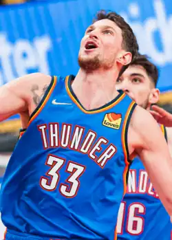 At the NBA trade deadline, the Thunder completed two trades with the Boston Celtics and the Phoenix Suns. The Thunder traded Mike Muscala to the Boston Celtics in exchange for Justin Jackson and two second-round picks.[82] Muscala, who re-signed with the Thunder this offseason, averaged 6.2 points on 39.4% three-point shooting in 43 games. Jackson, who played for the Thunder during the 2020-21 season, was waived following the trade.[83] Muscala's departure allowed the Thunder to prioritize more playing time for Jeremiah Robinson-Earl, Jaylin Williams and Ousmane Dieng, in addition to Chet Holmgren next season.[84] The Thunder also traded Darius Bazley to the Phoenix Suns in exchange for Dario Šarić, a second-round pick, and cash considerations.[85] Bazley's role decreased with the Thunder this year after averaging 10.8 points in the 2021-22 season to 5.4 points in 36 games this season. Šarić joins the Thunder after recovering from a torn ACL and missing the entire 2021-22 season averaging 5.8 points and 3.8 rebounds this season.[86] After waiving Justin Jackson, the Thunder converted Eugene Omoruyi's two-way contract to a standard contract extending through the 2023–24 season. Omoruyi became the fifth Thunder player to have their two-way converted into a standard contract, joining Deonte Burton, Luguentz Dort, Moses Brown, and Aaron Wiggins.[87] To fill in the open two-way slot, the Thunder signed Olivier Sarr who spent part of the 2021-22 season with the Thunder.[88] Sarr rejoined the Oklahoma City Blue in January after being waived by the Portland Trail Blazers.[89][90]