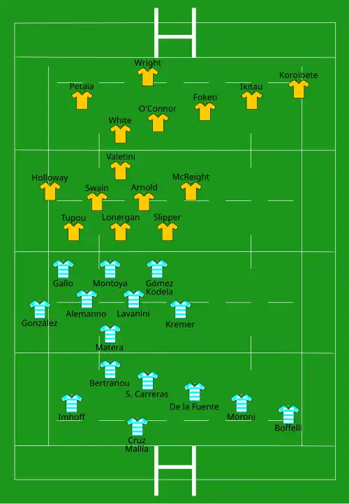 | Try: Imhoff 1' c Gallo (2) 5' c, 63' c De la Fuente 23' c González 30' m Boffelli 77' m Albornoz 80+1' c Con: Boffelli (5/7) 2', 6', 25', 64', 80+2' Pen: Boffelli (1/1) 53' | Report | Try: Slipper 11' c Ikitau 66' c Con: O'Connor (2/2) 12', 66' Pen: O'Connor (1/1) 16' |