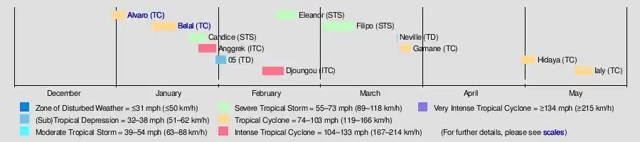 The season officially started on 15 November 2023, however the first system, Alvaro, would not form until 30 December. Alvaro became a tropical depression the next day, traversing the Mozambique Channel, before making landfall in Morombe District, Madagascar on 1 January 2024.[3] After a brief lull in activity, Tropical Cyclone Belal formed on 11 January.[4] Belal would affect Mauritius and Reunion, killing six people.[5][6] On 22 January, Moderate Tropical Storm Candice formed.[7] On 25 January, Intense Tropical Cyclone Anggrek entered the basin,[8] while Tropical Depression 05 emerging northeast of St. Brandon.[9] After a lull period of about 3 weeks, the strongest storm being Intense Tropical Cyclone Djoungou from 13 February and exited the basin 6 days later.[10] 17 February was the day Severe Tropical Storm Eleanor brought intense rainfall and winds which left at least 2 people injured, 10,000 customers deprived of electricity, several electricity pylons damaged, and toppled trees blocking several roads. It is the northern regions which suffered the greatest damage.[11] Severe Tropical Storm Filipo emerged on 2 March near Mozambique affecting 48,000 people and damaging 8,000 houses.[12] Tropical Depression Neville crossed into the basin on 24 March but MFR discontinued warning issuance.[13] Short-lived Tropical Cyclone Gamane emerged on 25 March north-northeast of Toamasina, Madagascar, causing a total of 19 deaths, 3 people missing and at least 90,000 affected.[14]