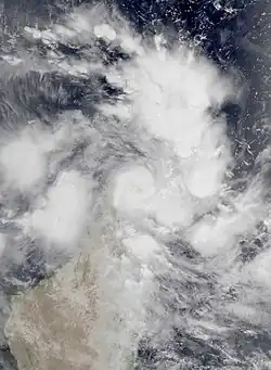 On 25 March, a zone of disturbed weather emerged 398 nautical miles north-northeast of Toamasina, Madagascar. MFR began issuing bulletins for a potential tropical cyclone that could form in the upcoming days. A few hours later, JTWC followed suit and issued a TCFA, indicating a low-level circulation with a symmetric area of deep persistent convection obscuring the center.[107] On the next day, JTWC designated the disturbance as Tropical Cyclone 20S. A few hours later, 20S rapidly intensified into a severe tropical storm and was assigned the name Gamane by the MMS. On 27 March, Gamane gained additional strength, further intensifying into a Category 2-equivalent tropical cyclone. Its LLCC continued to improve as it moved into more favorable conditions structurally. At 03:00 UTC, Gamane made landfall on the east coast of Madagascar, just north of Vohémar. From this point, land interaction caused Gamane to weaken significantly — in the morning of 28 March, satellite imagery demonstrated that its deep central and feeder band convection had become disorganized as it tracked inland over the mountainous terrain of Northern Madagascar.[108] MFR issued its final warning after Gamane degenerated into a disturbance on March 28 at 12:00 UTC.[109]