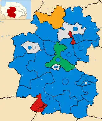 In 2023, the Conservative party again lost seats, though maintained a majority on the council with thirty of the 49 available seats. The Labour Party made the largest gains, with six additional seats from the district's largest towns of Thetford and Dereham. One additional independent was elected, the Green Party lost one of the two seats they had gained in 2019 back to the Conservatives, and the Liberal Democrats gained a seat for the first time in over twenty years.[4][5]