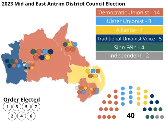 The 2023 election to Mid and East Antrim District Council was held on 18 May 2023, alongside other local elections in Northern Ireland, two weeks after local elections in England.[1] The Northern Ireland elections were delayed by 2 weeks to avoid overlapping with the coronation of King Charles III.[2]