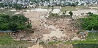 Landslides in Shaoguan caused by heavy downpours injured six people and damaged 80 homes. Losses were estimated to be around 140 million yuan.[2] Waterlogged soil led to a highway collapse in Meizhou on 2 May, killing at least 48.[3]