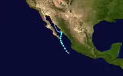 A tropical wave left the coast of Africa on July 10. The wave approached Central America over a week later, interacting with the Eastern Pacific monsoon trough. The combined disturbance continued westward, and began to organize its shower and thunderstorm activity on July 23 to the southwest of Mexico. The system eventually organized into a tropical depression at 12:00 UTC on July 24, about 400 nautical miles south of Cabo San Lucas.[21] Bud moved to the northwest, and despite being embedded in an environment of dry air,[22] the system was able to strengthen modestly and achieved its peak intensity at 6:00 UTC on July 25, with maximum sustained winds of 60 mph (97 km/h) and a minimum barometric pressure of 1,001 mbar (29.6 inHg).[21] Continued movement through a dry-air environment caused Bud to weaken later that day,[23] and the storm degenerated to a post-tropical cyclone the following day. Bud's remnant low drifted to the southwest until dissipating by July 29.[21]