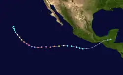 A two-week break in activity came to an end when Tropical Storm Ileana formed on September 12.[14] The storm grazed northwestern Mexico twice before dissipating.[15][16] Hurricane John developed over a week later and rapidly intensified into the second major hurricane of the season prior to making landfall in southern Mexico.[17][18] In late October, Hurricane Kristy formed off the coast of southern Mexico, in-part from the remnants of Atlantic basin Tropical Storm Nadine, and intensified to Category 5 strength out in the open ocean.[19] It was the first Category 5 Pacific hurricane in a non-El Niño year since Celia in 2010.[4] Tropical Storm Lane and Tropical Depression Fourteen‑E developed in early November; both systems remained out to sea.